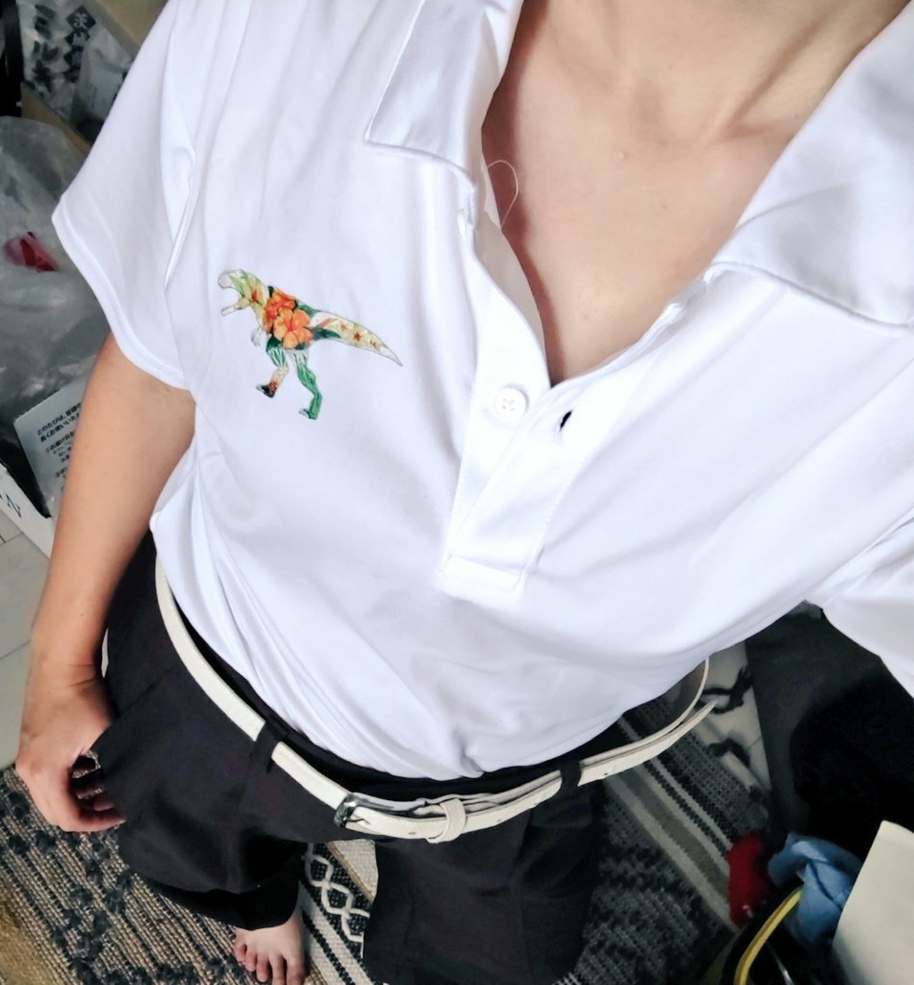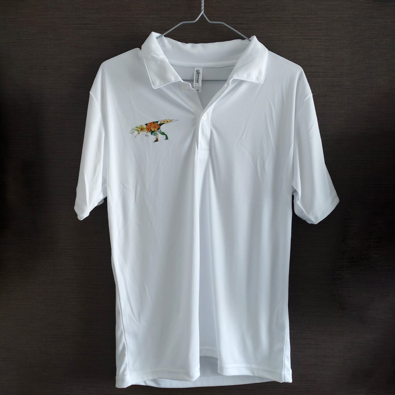 白亜回廊ポロシャツ。右胸にカルカロドントサウルス。写真はMサイズです。