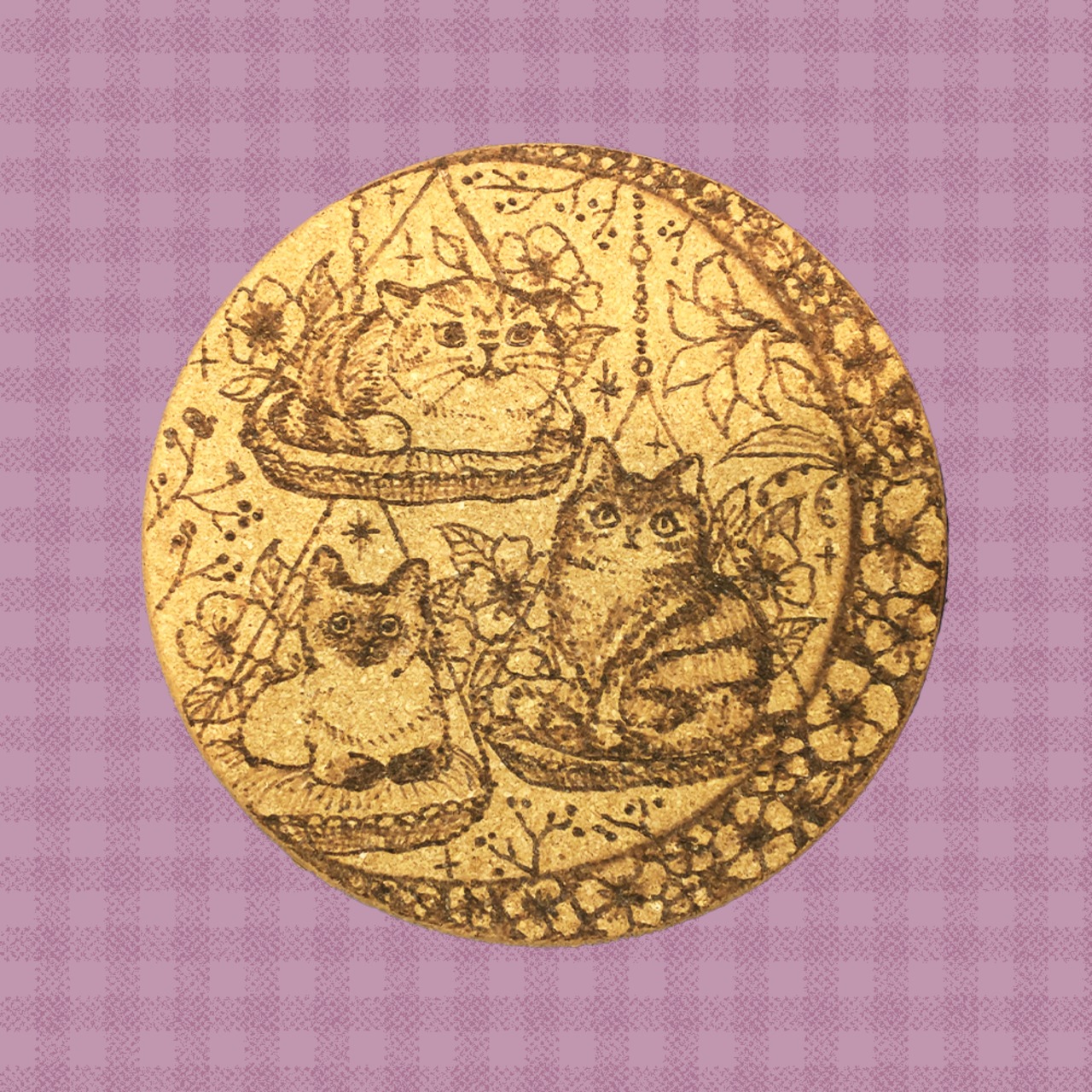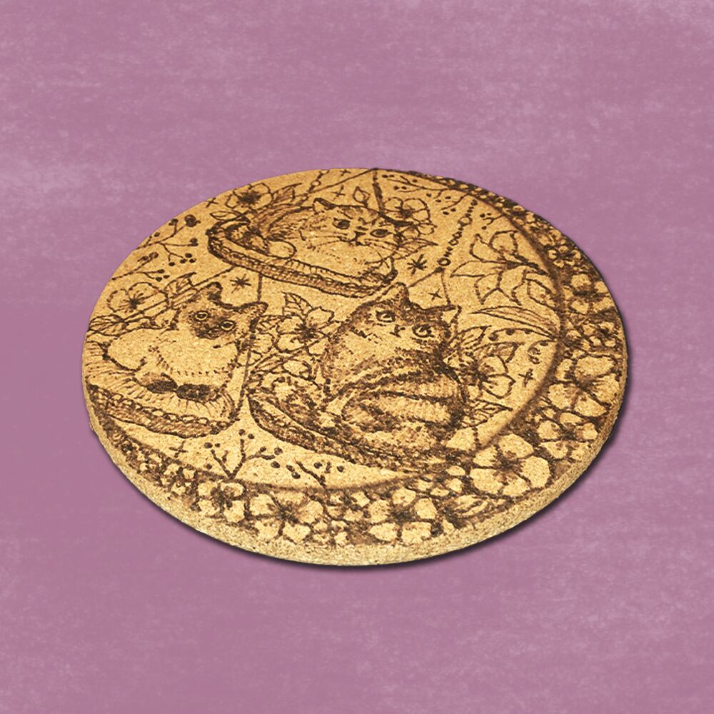 猫たちの鍋敷きです。ウッドバーニングで描いたイラストの1点もの。
