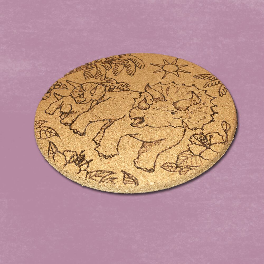 トリケラトプスの親子の鍋敷きです。ウッドバーニングで描いたイラストの1点もの。
